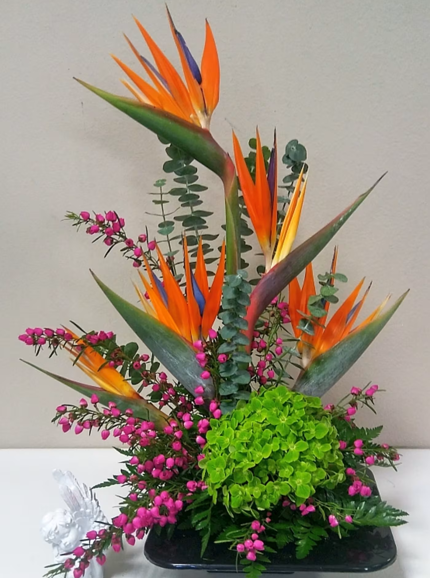 Stylishly designed birds of paradise with hydrangea, baronia or wax flower and eucalyptus.