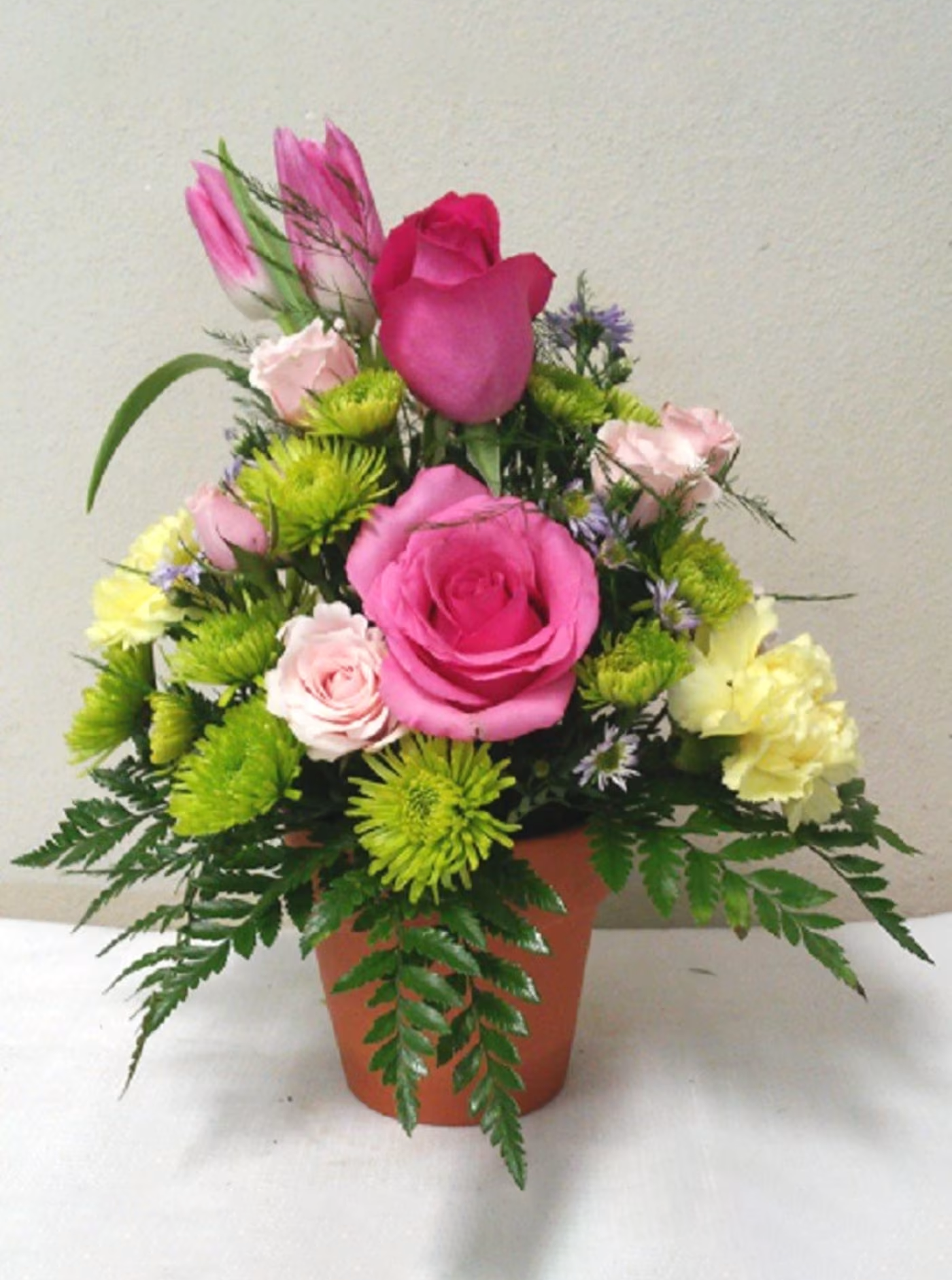 An adorable flower arrangement made in a Clay Flower Pot. *Deluxe Shown