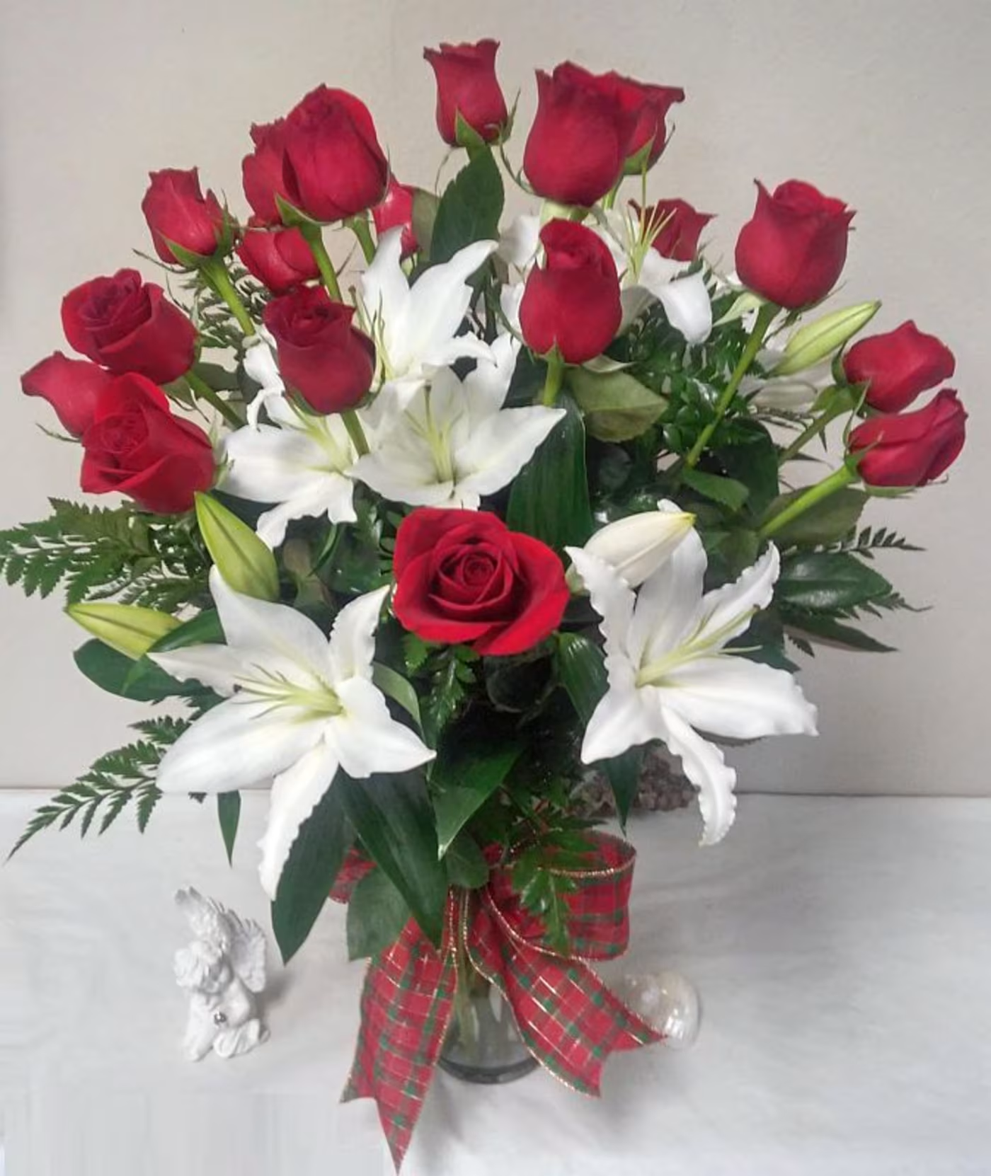 One Dozen Red roses and white lilies make that statement that is just right. Deluxe has 18 rose and Premium has 24 roses.